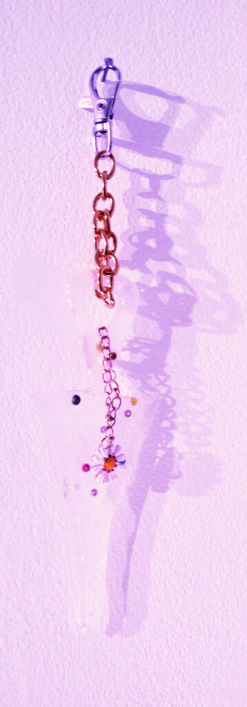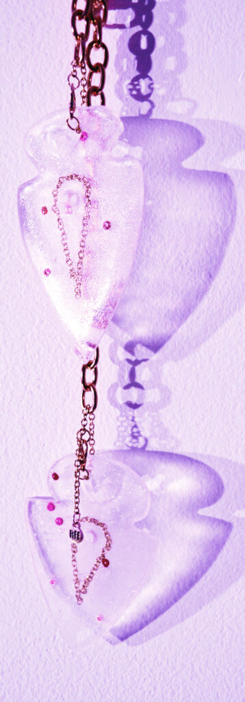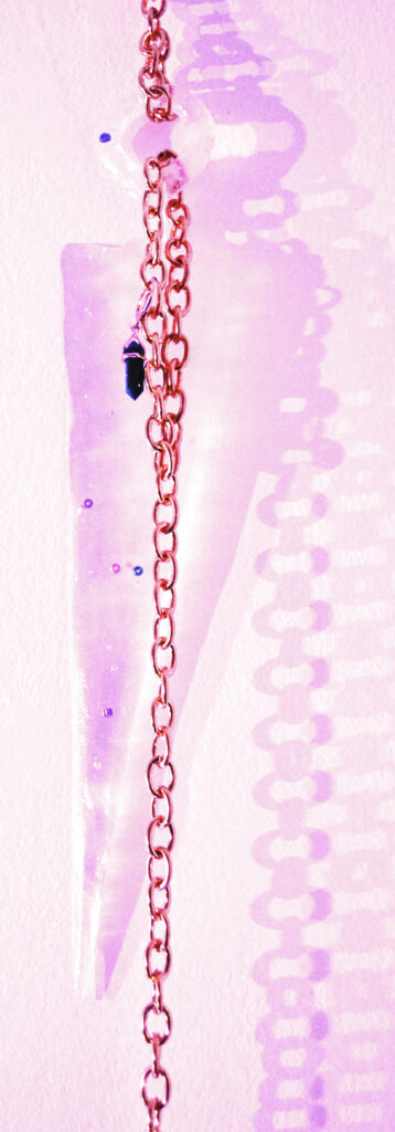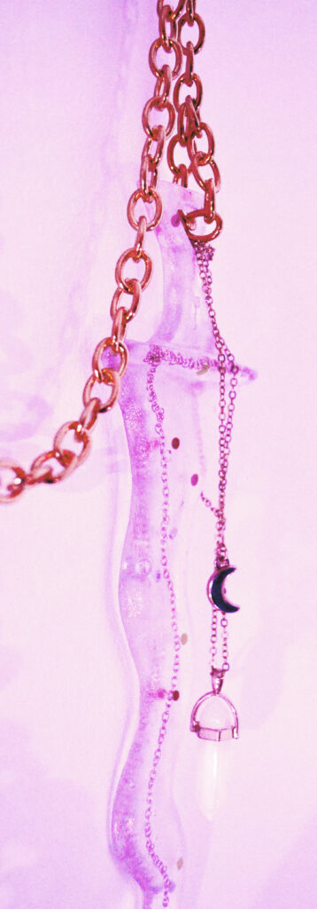 Résine, perles, sequins, fil de cuivre, chaînes et bijoux