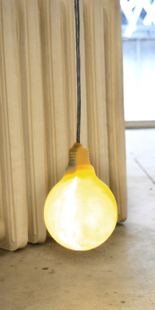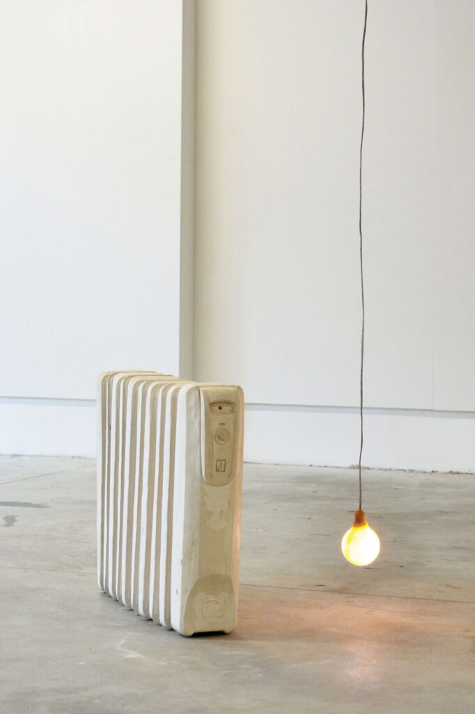 Le radiateur quant à lui est un symbole de chaleur, la constance d’un intérieur qui contient. Dans ses creux et ses pleins se glisse un concentré d’énergie, une source vitale en survivance que l’ampoule laisse échapper en venant pendre le long de son corps.