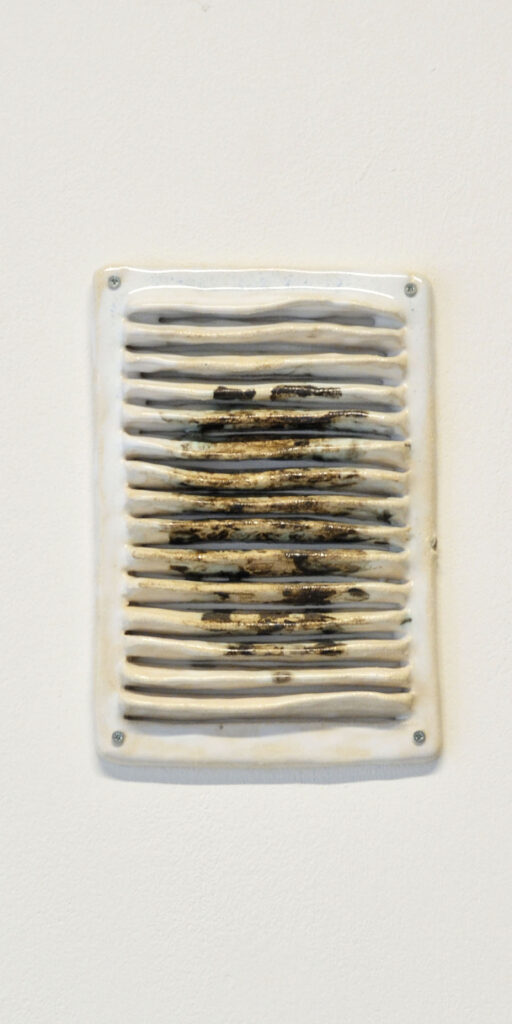Cette installation se présente donc comme un espace du repos. Par la céramique et le plâtre, j’ai cherché à refaçonner ces objets du ras du mur. L’émail sur la grille d’aération accentue sa valeur de fac-similé en imitant grossièrement la crasse et la poussière qui s’amassent sur ces formes domestiques oubliées.