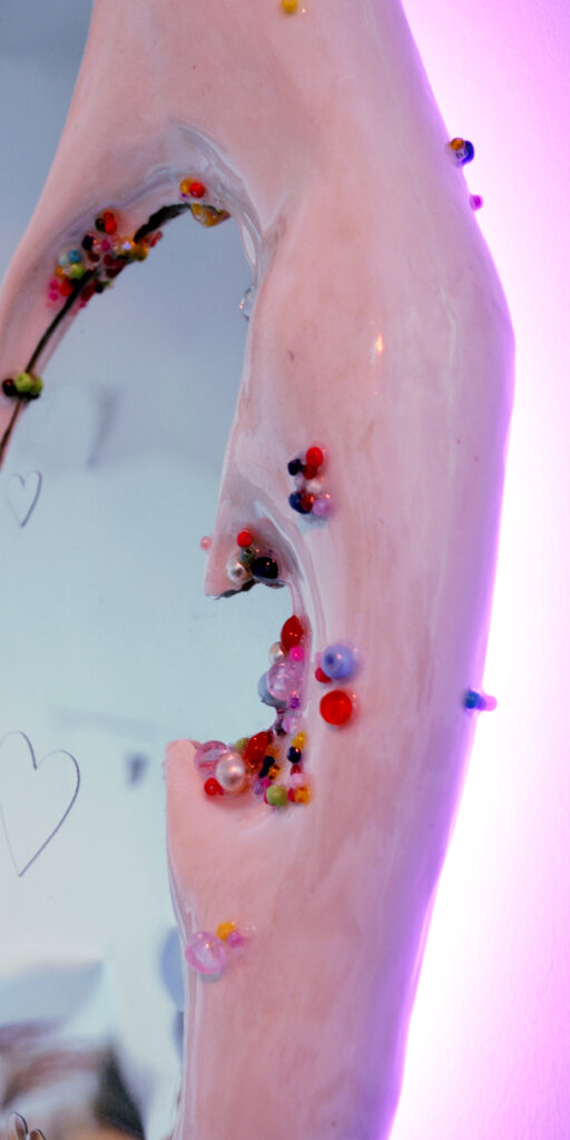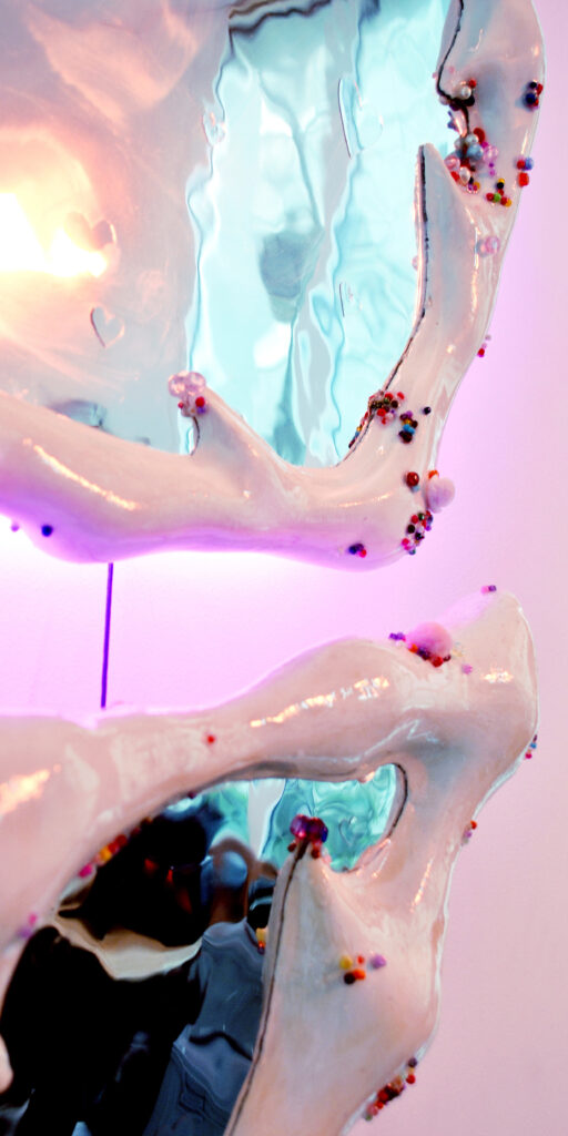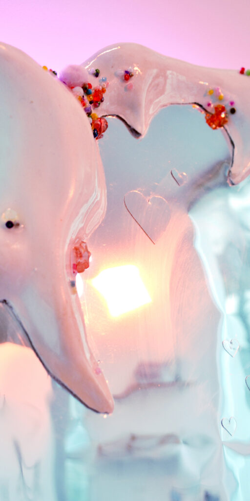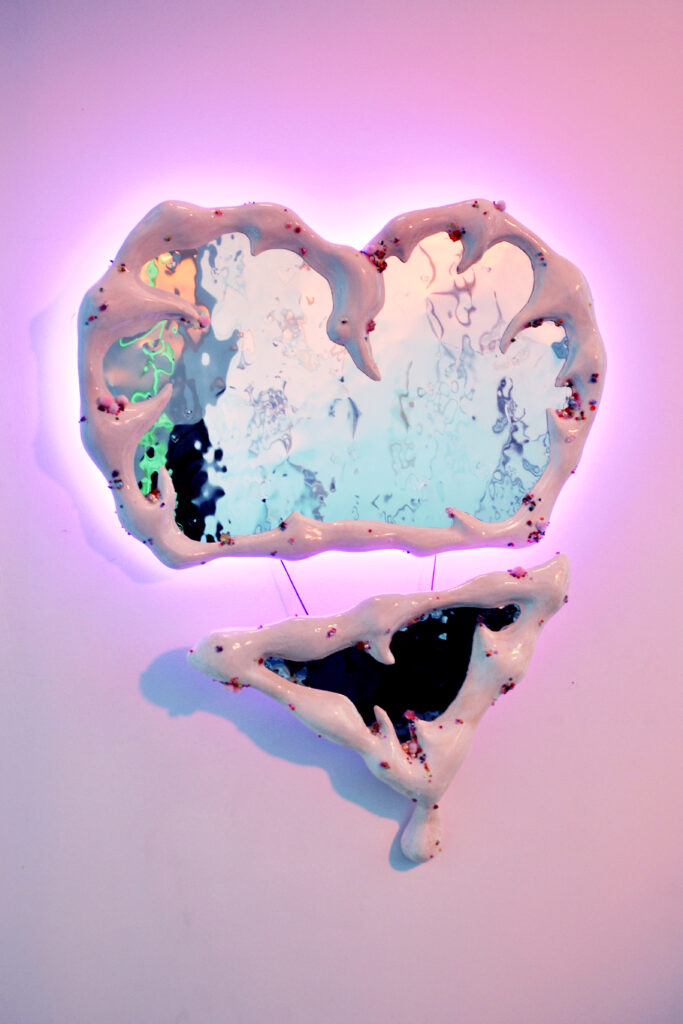 Suspendue par ses tendons, la pointe d’un coeur fendu s’accroche au mur. Ses tentacules pétrifiés, déjà attaqués par un corail artificiel perlé, lèchent sa surface miroitante. Elle gondole et se distend à mesure que l’on y plonge le regard.