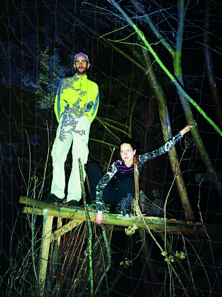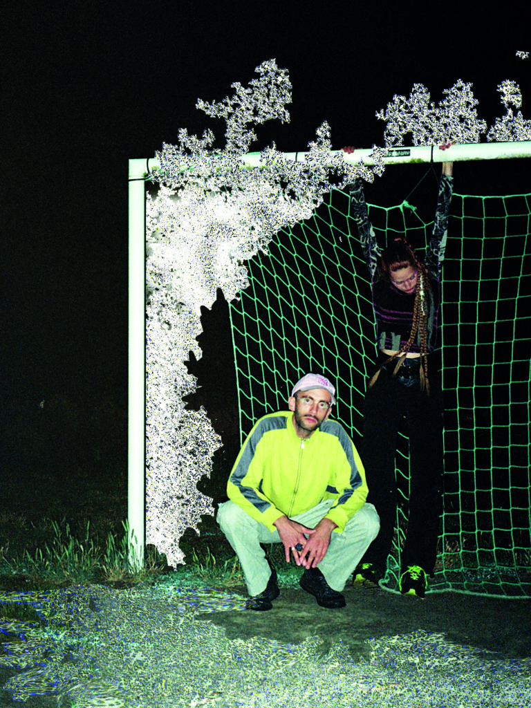 Sous le speudonyme de KandraKar, je me suis associée à 1_2_c_4, l’artiste Alice Hofer Oudot, pour une collaboration photographique et graphique issue d’un shooting rushé dans la pénombre d’un terrain vague. Sur les images, les corps des artistes Foxxi et Aster, du groupe evenl0ad, s’emmêlent entre le filet d’une cage de foot, les branches grinçantes d’une cabane de sorcière et les fleurs sauvages.